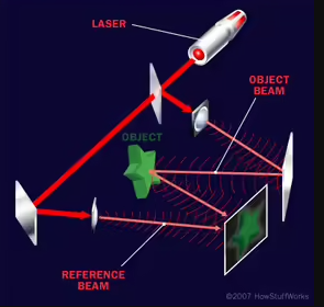 Using photonic components, such as lasers, lenses, mirrors, and beam splitters to record a 3-D image and reconstruct it simultaneously or at a later time on a 2-D surface.